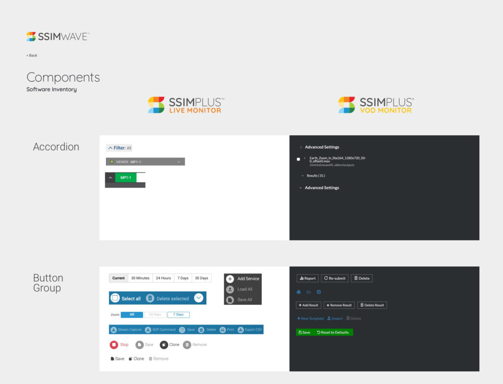 The SSIMWAVE software portfolio included four products with three separate interfaces and UI languages. As I reviewed the product line, it was clear they would benefit from a design system and component library. This would improve design, development, and QA times and give a boost to the brand by providing a consistent experience across the board.